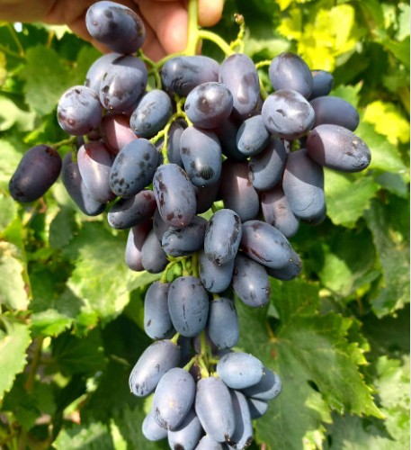 «Академик Авидзба» — ранний столовый сорт для тех, кто хочет получить вкусный и стабильный урожай уже в середине лета. Кисти цилиндро-конические, ягоды крупные (примерно 33×20 мм), с насыщенным сине‑чёрным цветом, плотной кожицей и плотной мякотью. Вкус десертный, сахаристость около 170 г/дм³, дегустационная оценка 9,2/10. Сорт высокоурожайный и хорошо переносит транспортировку.